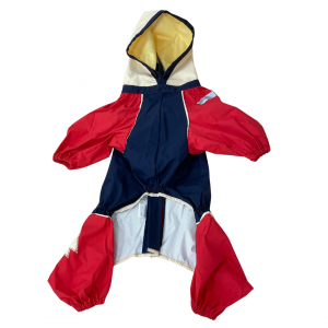 撥水力No.1のムレを防ぐ優れた透湿性の素材を使用!ズボンタイプで一番着せやすい犬用レインコート。