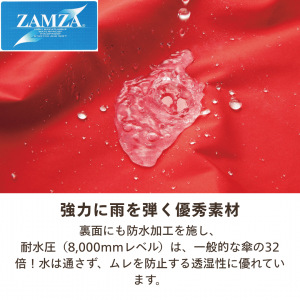強力に雨をはじく撥水力No.1素材「ZAMZA」使用。パワフルなはっ水性に加え、裏面は防水加工。耐水圧は、一般的な傘の32倍!水は通さず、ムレを防止する透湿性に優れています。そのため犬の肌に刺激がなく、快適に過ごせます。