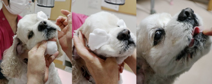 ① 診察時の診察室でのマイボシャンプーの使用;柴犬 マイボシャンプー後、水道水で湿らせた脱脂綿で清拭